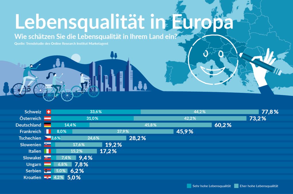 Wirtschaft Zahlen & Fakten der Wirtschaft von florian.fuchs@awg-verlag.at 5. Mai 2022 5. Mai 2022 2 Minuten lesen 68 Österreich im Mittelfeld In einer weltweiten Umfrage zu 78 ausgewählten Nationen wurde unter mehr als 17.000 Personen die Wahrnehmung eines Landes anhand von 76 Eigenschaften, die mit einer modernen Nation in Verbindung gebracht werden, bewertet. Die Befragten sind RepräsentantInnen unterschiedlicher Schichten (informierte Eliten, WirtschaftsentscheiderInnen und DurchschnittsbürgerInnen) aus 36 Ländern in Amerika, Asien, Europa und Afrika. Den Top-Wert (Indexwert 0 bis 10, je höher desto besser) erreichte in dieser Umfrage Japan, knapp vor Deutschland. Östereich landete mit einem Wert von 6,0 in diesem Ranking auf Rang 16. Gerne leben in Österreich Insgesamt 5.500 Interviews aus elf europäischen Ländern des Online Research Instituts Marketagent geben Aufschluss darüber, wie es sich aktuell mit der Lebenszufriedenheit in Europa verhält. Klare “Gewinner” in dieser Umfrage sind die deutschsprachigen Länder in Mitteleuropa. Fast drei Viertel der ÖsterreicherInnen schätzen ihre Lebensqualität derzeit sehr oder eher hoch ein (73,2%). Damit liegt man hierzulande im Europavergleich gemeinsam mit der Schweiz und noch vor Deutschland klar im Spitzenfeld und deutlich über dem europaweiten Durchschnitt von 31,8%. Die Schlusslichter im Ranking stellen Serbien (6,2%) und Kroatien (5%) dar. Sparen in Europa Sparen ist und bleibt laut der Trendstudie des Online Research Institut Marketagent ein Klassiker und genießt weiterhin großen Stellenwert in Europa. Für immerhin 51% der Befragten hat das Sparen auch angesichts der aktuell schwierigen Wirtschaftslage einen sehr großen bzw. eher großen Stellenwert, was eine Steigerung gegenüber dem Vorjahr (49,9%) bedeutet. Nur für knapp über 10% EuropäerInnen hat Sparen einen sehr geringen Stellenwert. FaktenFinanzenStartUpUpdateWirtschaft 0 FacebookTwitterPinterestEmail voriger Beitrag Kluge Unternehmer machen Regionalität zur Marke. nächster Beitrag Neue Liebesbeziehung zwischen Banken und Startups Ähnliche Artikel Zahlen & Fakten der Wirtschaft 27. Januar 2023 Zahlen & Fakten der Wirtschaft 21. Dezember 2022 Liquiditätsmanagement: Worauf es ankommt 21. Dezember 2022 Zahlen & Fakten der Wirtschaft 16. Dezember 2022 Zahlen & Fakten der Wirtschaft 14. Dezember 2022 Wie es den Unternehmen im permanenten Krisenmodus geht 22. November 2022 Zahlen & Fakten der Wirtschaft 2. November 2022 ABC Fliesen- und Bauwaren 31. Oktober 2022 Zahlen & Fakten der Wirtschaft 12. Oktober 2022 „Grüne“ Termine für Unternehmer 21. September 2022
