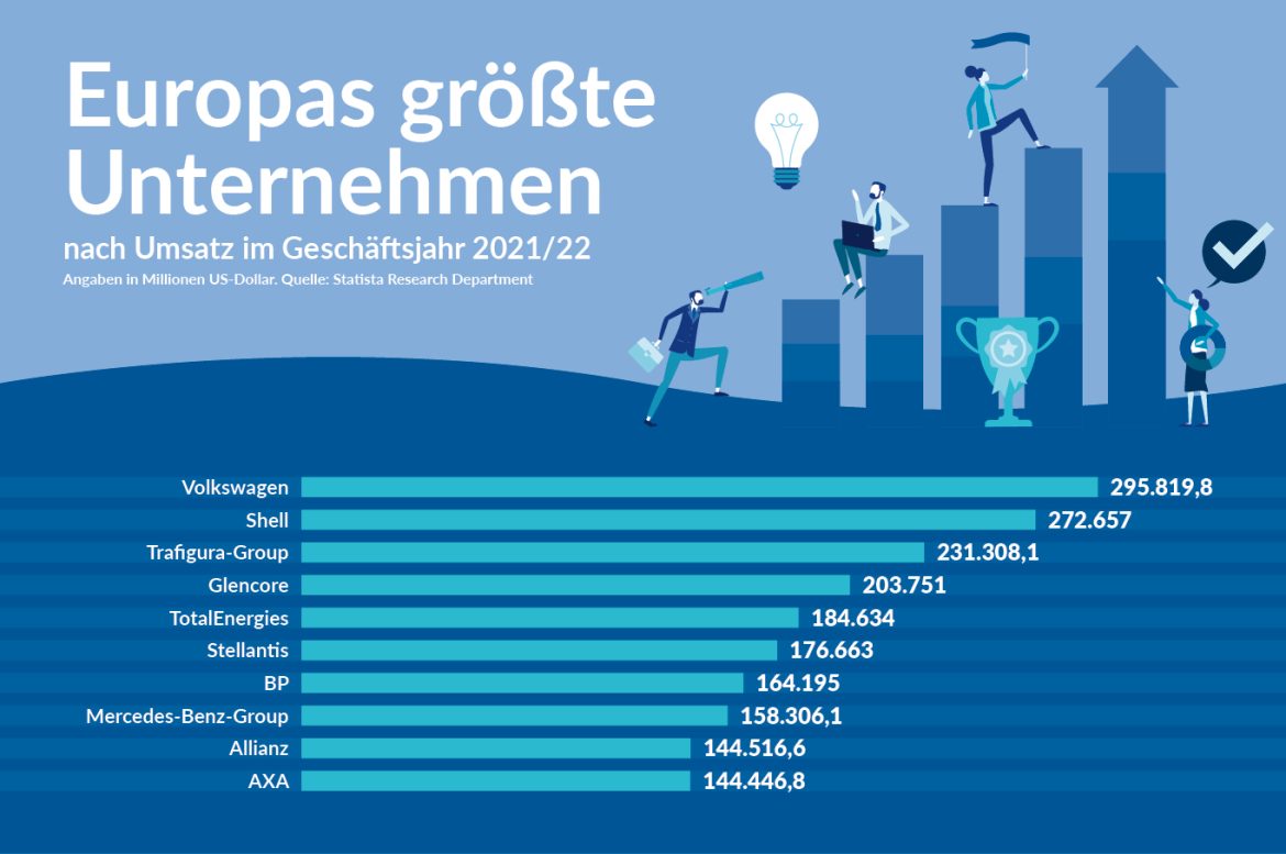 Wirtschaft Zahlen & Fakten der Wirtschaft von florian.fuchs@awg-verlag.at 21. Dezember 2022 21. Dezember 2022 2 Minuten lesen 411 Volkswagen in Front Die Statistik zeigt die größten Unternehmen in Europa nach ihrem Umsatz im Geschäftsjahr 2021/2022. Die Daten beziehen sich auf die aktuellsten verfügbaren Geschäftsjahre (endeten am 31. März 2022 oder vorher). Volkswagen war im betrachteten Zeitraum mit einem Umsatz von rund 295.819,8 Milliarden US-Dollar das umsatzstärkste Unternehmen Europas. Dahinter landen das weltweit größte Mineralöl- und Erdgas-Unternehmen Shell und die niederländische Trafigura-Group. Ösis fliegen oft? Manchmal? Gar nicht? Jede dritte Person in Österreich steigt nicht ins Flugzeug, wie eine repräsentative Umfrage des MARKET-Instituts zeigt. Die Hälfte von Österreichs Bevölkerung ab 16 Jahren fliegt einmal im Jahr oder seltener. Und nur eine von sechs Personen fliegt mehrmals pro Jahr. Chrome glitzert von Platz 1 Die erste Version von Chrome wurde im Jahr 2008 veröffentlicht und war zuerst nur für Microsofts Windows-Betriebssystem verfügbar. Später folgten dann auch Versionen für Linux, macOS, Android und iOS. Im Jahr 2012 konnte Chrome sowohl den Firefox-Browser als auch den Internet Explorer erstmals in puncto Marktanteilen überholen. Mittlerweile ist Chrome unangefochten der meistgenutzte Browser der Welt. Die Daten beziehen sich auf die Nutzung mit Desktop- und Notebook-PCs (ohne Smartphones und Tablets). FaktenUpdateWirtschaft 0 FacebookTwitterPinterestEmail voriger Beitrag Liquiditätsmanagement: Worauf es ankommt nächster Beitrag Umfrage: Work-Life-Balance Ähnliche Artikel Zahlen & Fakten der Wirtschaft 27. Januar 2023 Zahlen & Fakten der Wirtschaft 16. Dezember 2022 Zahlen & Fakten der Wirtschaft 14. Dezember 2022 Wie es den Unternehmen im permanenten Krisenmodus geht 22. November 2022 Zahlen & Fakten der Wirtschaft 2. November 2022 ABC Fliesen- und Bauwaren 31. Oktober 2022 Zahlen & Fakten der Wirtschaft 12. Oktober 2022 „Grüne“ Termine für Unternehmer 21. September 2022 Kreislaufwirtschaft ist mehr als Recycling 13. September 2022 Zahlen & Fakten der Wirtschaft 30. August 2022